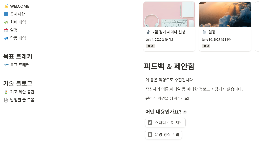 함께 노션을 통해 동호회 사이트를 만들어나가고, 관리를 시작할 수 있었습니다.