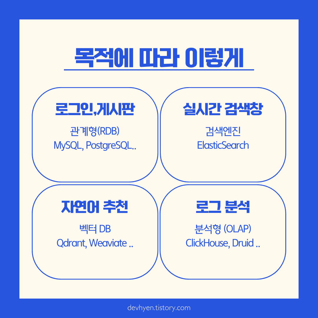 | 쿠팡 | PostgreSQL + Elasticsearch + ClickHouse | 상품/주문 정보는 RDB에, 검색은 Elasticsearch, 매출·트래픽 분석은 ClickHouse |