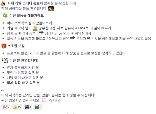 2025.07.04 - [회고] - 사내 개발 스터디를 만들었습니다 사내 개발 스터디를 만들었습니다회사에서 개발자들과 기술 이야기를 나누는 방법 크래프톤정글과 팀메이트 활동을 하며 서로 다른 회사를 다니고, 서로 다른 분야의 개발을 하는 사람들이지만개발자들과 기술 이야기를 나눌devhyen.tistory.com사내 개발 스터디를 만든 후첫 세미나 발표를 끝냈다. 기획 모두의 퇴근 후 시간이 소중하기에, 6시부터 7시까지 한 시간으로 짧고 굵게 준비했다.세미나는 매달 말 진행하기로 했고, 이번엔 동호회 창립 후 첫 세미나였기에, 서로의 일정을 조율하다 보니 7월 세미나가 8월 초에 진행되었다. 앞으로 날짜를 고정으로 진행하게 될 듯 하다. 월간 세미나에서는 3명의 발표자를 자원받는다. 다행히 첫 세미나..